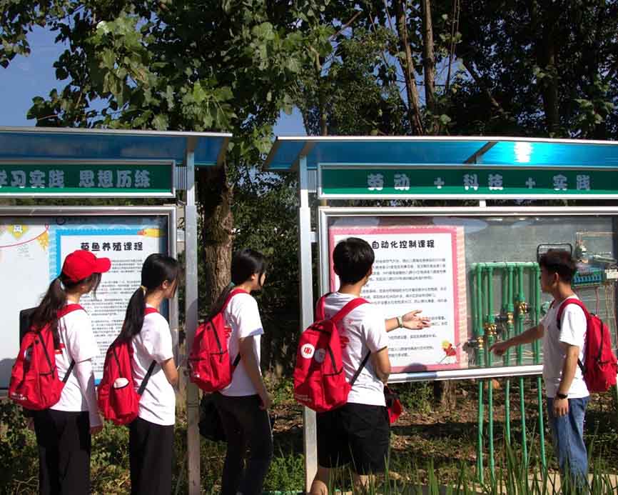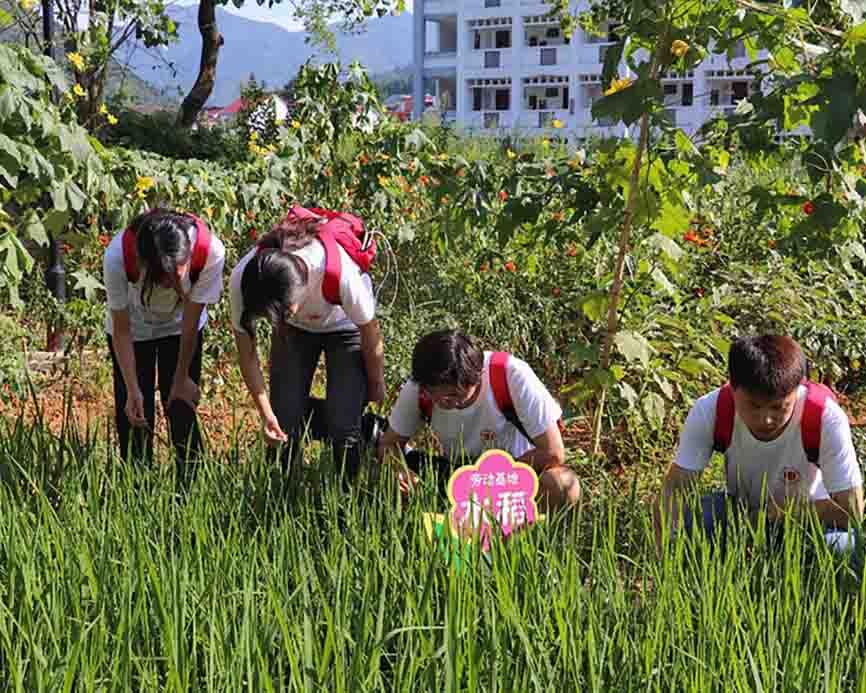 图为实践队成员参观新篁学校农业生产课程,初步了解新篁乡的农业教育情况