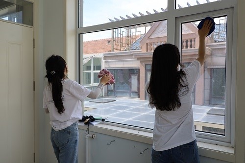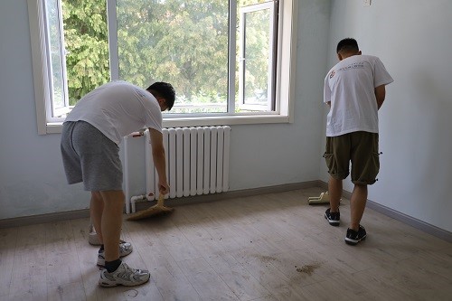 赵尊,曲宏帅带领队员前往民宿改造地开展清理民宿改造地和实地测量工作。根据改造地上下两层的格局,实践团分为两组,分别分组作业。根据房间的具体格局,两队成员“因房制宜”,制定配套方案,合理有效地分配工作。一楼,赵尊组明确“先洒水,后拖地” 的方案,极大的提高工作效率。二楼,曲宏帅组采取“先扫后拖,循序渐进” 的方案,减轻拖地工作难度。同时,韩倩倩、焦体昌对房间尺寸进行测量,预估摆放物品尺寸。