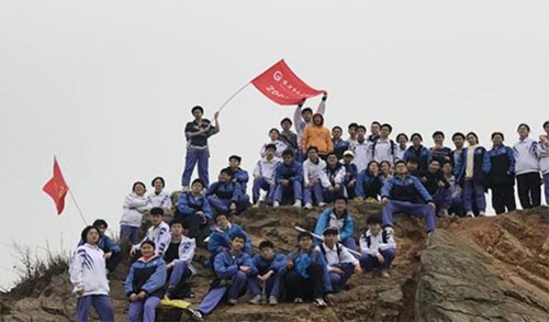 当行至九郎山半山腰中途休息时,班主任询问同学们累不累,如果累就下山返校;如果还能坚持,想再挑战一下自己,就走上山的路,一鼓作气登上顶峰。同学们一下子来了兴致,也顾不上休息,大部队掉头继续冒雨往山上走去。最终,全班同学成功登上顶峰,在雨中拍下了十分珍贵的合影——“山高人为峰”。