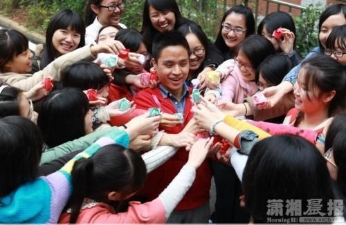 11月10号是学校的男生节,班上的女生每人给他折了一朵玫瑰花,还专门制作了男生节的专题视频和幻灯片。这是湖南师范大学外国语学院2012级英语教育二班,唯一的那个男生叫田鑫。