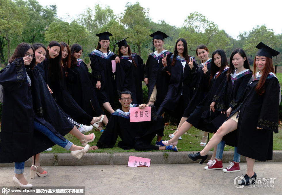 图为毕业生全班女生围着一个男生摆出姿势拍照。