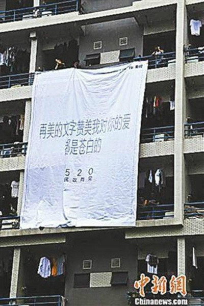 大二男生找到女朋友 全宿舍挂横幅祝贺