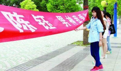 宿迁学院的校园主干道上,一条写着“10社保陈钰,男神我爱你”的告白横幅很是惹眼,让人感慨大学生对于感情的大胆表白。