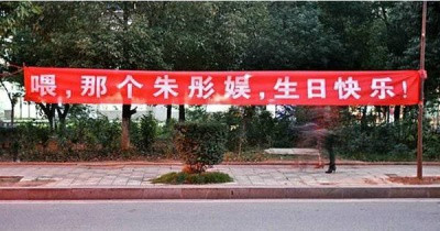 喂,那个朱彤娱,生日快乐!”,这横幅是想演偶像剧吗