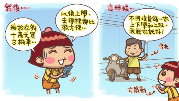 想说买台机车方便上课 +上班,就不用老是赶公车或是依赖别人载。没想到此时男友佛心大放送,说交通问题交给他没问题,要妹子把买机车的 10万元省下来 (贴心捏)。想不到吼,温柔体贴的背后竟然有阴谋啊...