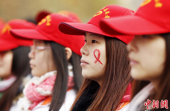 2014年11月30日,一名浙江农林大学的学生在世界艾滋病日主题宣传海报上粘贴祝福心愿。 当日,浙江农林大学学生在世界艾滋病日主题宣传海报上粘贴红丝带。在12月1日“世界艾滋病日”来临前夕,浙江农林大学开展“遏制艾滋,携手同行”为主题的预防艾滋病、关爱艾滋病感染者的宣传教育活动。通过发放宣传资料、签名、制作红丝带等活动,表达对艾滋病感染者的关爱。
