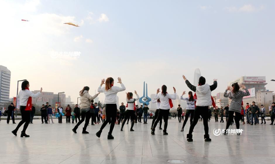 2015年1月23日讯,在济南泉城广场,山东体育学院的女生在蓝天白云下,上演了一场劲爆的快闪舞蹈。