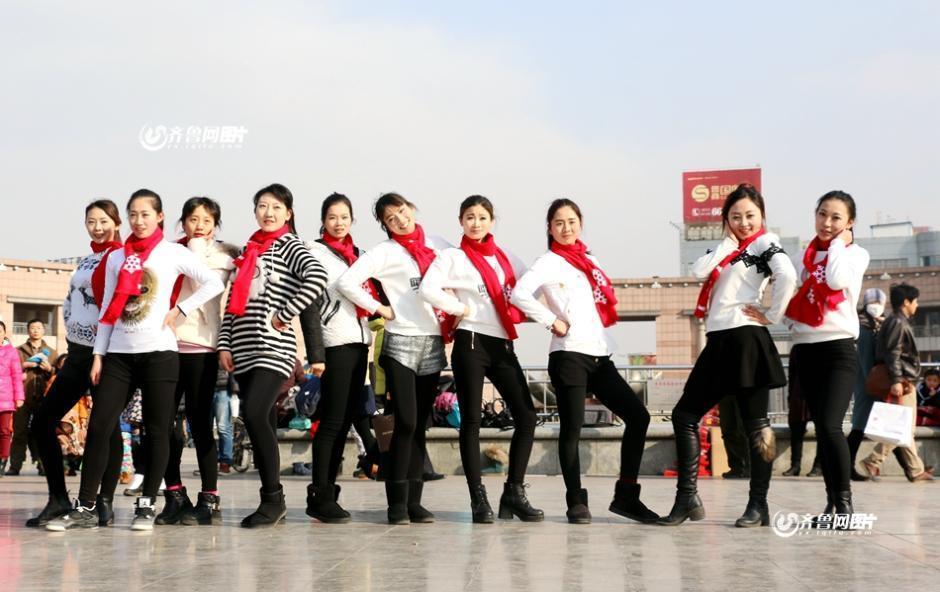 2015年1月23日讯,在济南泉城广场,山东体育学院的女生在蓝天白云下,上演了一场劲爆的快闪舞蹈。