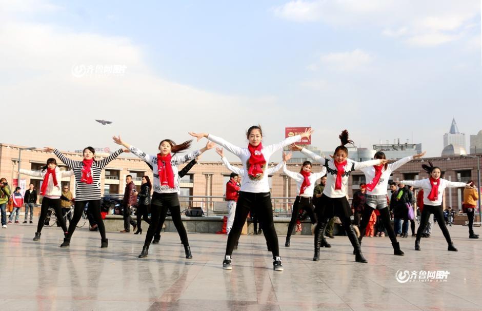 2015年1月23日讯,在济南泉城广场,山东体育学院的女生在蓝天白云下,上演了一场劲爆的快闪舞蹈。