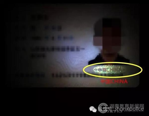 垂直观察看不到,适当上下倾斜证件,可以观察到“中国CHINA”字样,字符周围有花纹环绕,外沿呈椭圆形,改变观察角度可以看到亮字暗底和亮底暗字的正负镶嵌效果。