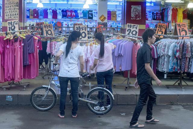 厂区周边普通卖鞋子卖衣服的比拟廉价,不是说这些工人没钱买,而是很多货都可以低价从厂区内部拿。图为女工正在选购花花绿绿的衣服。