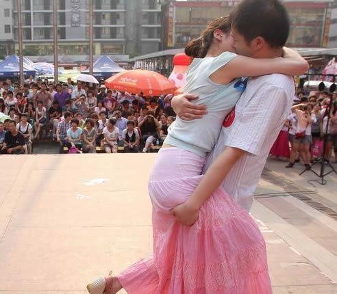 情侣街头举行接吻大赛,双腿把男的夹紧