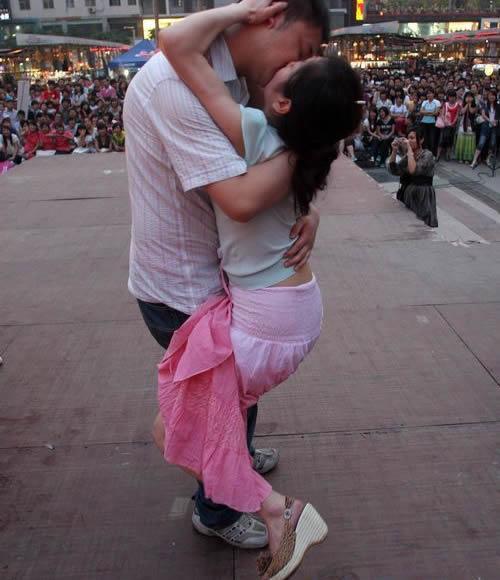 情侣街头举行接吻大赛,双腿把男的夹紧