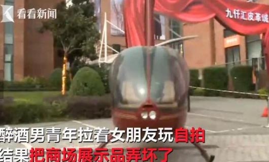 商场的负责人介绍,这架直升飞机可不是模型,而是真家伙,是商场租来提升人气的,同时也让顾客们拍拍照,合合影。不过这一男一女却越过了警戒线,损坏了飞机的门锁,进入内部玩自拍。