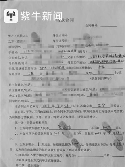 紫牛新闻记者看到,在小洁签订的“校园贷”借款合同上,作为甲方的出借人都是空白,有的借条连向谁借、从哪个机构借都没写,极不规范,但小洁却要在合同上写上包括自己奶奶、父母、同学、老师至少7个手机号码,这也为催债埋下了伏笔。
