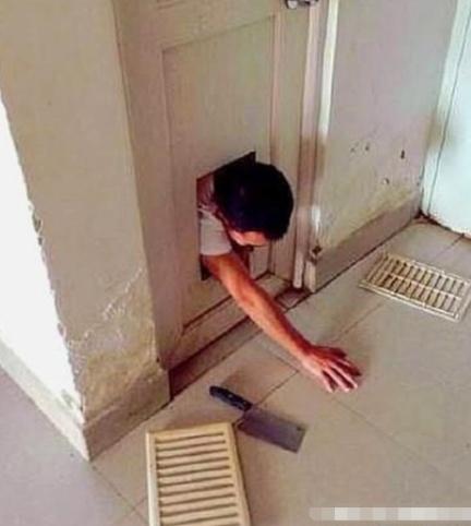 这个同学,你这是学贞子?还是学的甄子丹?从个透风口出来也是有点身材啊!而且这力道,估计学的甄子丹?从厕所里爬出来的贞子?嚯,够不容易的!等等那把菜刀是怎么回事?