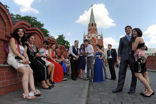 豪放俄罗斯学生盛装出席国会大厦毕业舞会