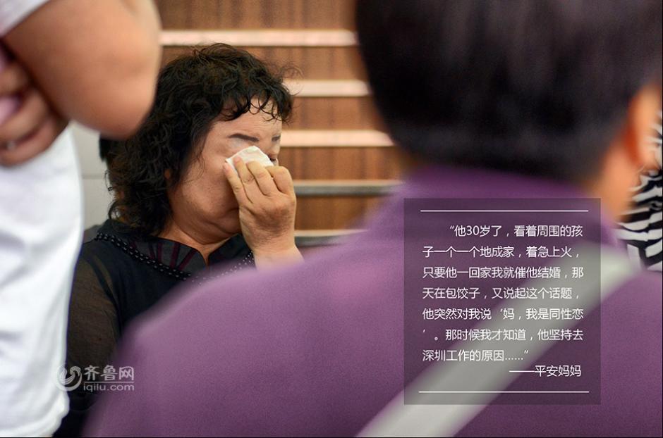 平安妈妈的儿子今年30岁了,在深圳工作。而平安妈妈和老伴儿住在沈阳。向记者讲述自己经历的过程中,这位妈妈的眼泪一直止不住往下流。平安妈妈说,儿子告诉她性倾向的第二天,她就接受了。因为想到孩子多少年都是自己走过来的,很心疼。