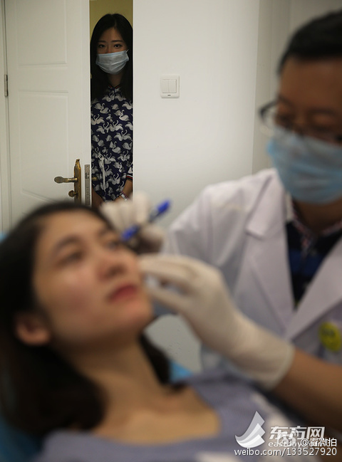 图为闺蜜Baby陪同Sandy一起前来,注射手术开始前,Baby隔着门缝向手术台上的Sandy张望。对于整容这件事,姐妹俩已经酝酿了许久。Sandy则将接受眼部注射除皱整形。这样一只进口的肉毒杆菌注射针剂的价格再3、4千元。
