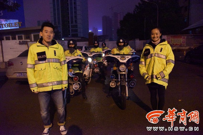 【21:00】郭家庙巡逻结束,何雨阳和徐婷站在巡逻队前和队员们合影留念,他们即将前往凤城五路盘查点体验盘查工作。