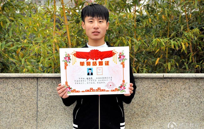 这张“单身结婚证”有A3纸张大小,在抬头用醒目的红色字体写着“单身结婚证”,左侧贴上自己的照片,而右侧则是未来将要努力实现的目标。