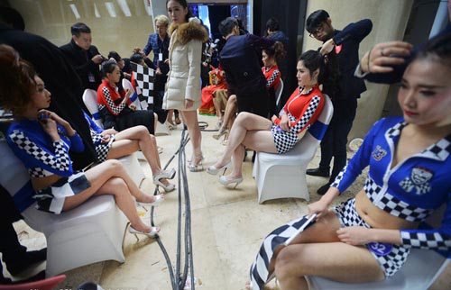 总决赛舞台背后是一个狭小的更衣室,刘璐和其她美女模特在这里更衣、化妆,备战当晚的总决赛。