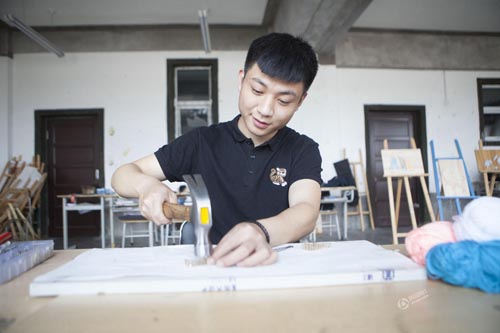 每一幅作品都是蔡孙翔用手一根根地钉,难免锤子砸伤手,痛得不行。“看着简单,其实还是有难度的。”蔡孙翔说,“钉子高了不行,斜了不行,缠毛线要根据层次和纹路的不同,以及颜色的搭配,这些都需要自己一点点的研究。有时候缠错一步线,可能要退回好几步,重新再缠,这需要足够的耐心和一些技巧。”图为蔡孙翔正在教室内创作作品。