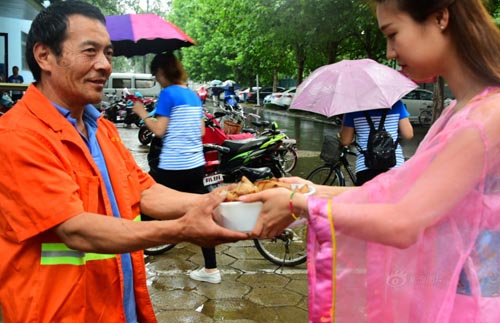 女大学生穿古装包粽子 送一线环卫工