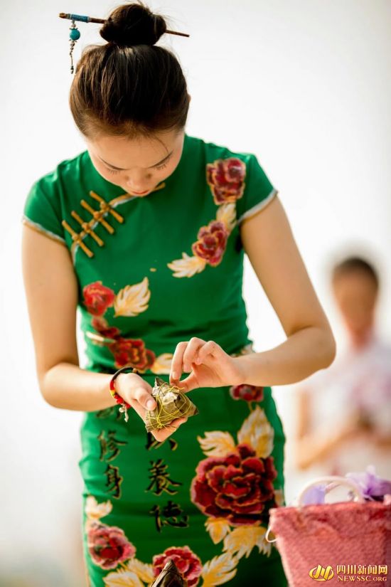 大学美女准空姐穿旗袍跟食堂阿姨学包粽子