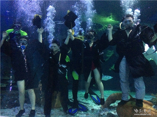 6月25日早上10点,水下毕业照小组就来到武汉海昌极地海洋公园。大家都是第一次潜水,难免有点紧张,前一小时拍出的效果面部狰狞。同学们向公园潜水员请教之后逐渐掌握潜水技巧,这组唯美的照片最终在5人的努力下完成。