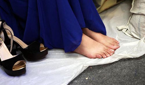 不停地站在汽车旁边变换动作,保持笑容面对观众和摄影师,20分钟休息一次,小婷一休息就脱鞋放松,做模特经常要站很久,又要穿着高跟鞋,所以脚上经常起泡。