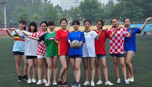 女大学生助力欧洲杯 穿球衣青春靓丽