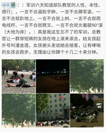 该帖子称,“据网友爆料:郑州某高校教官爆粗称,想看到学生们痛苦的样子,让学生爬树,女学生穿短裤被罚地上滚、劈叉,称披发女生是‘去接客’,要求女学生加自己微信,要求学生用美丽语言形容他的腿,夸的好可以免体罚,夸得不好了直接体罚,还打学生”。此外帖子下方还配有发帖人与网友的聊天记录截图。