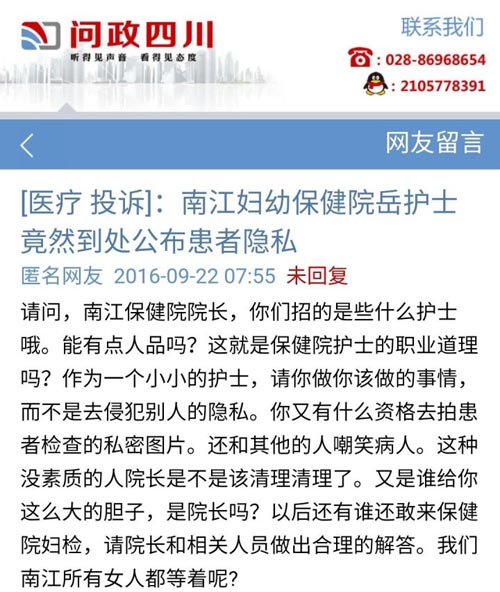 四川一护士拍患者妇检私密照传网上"讨论"