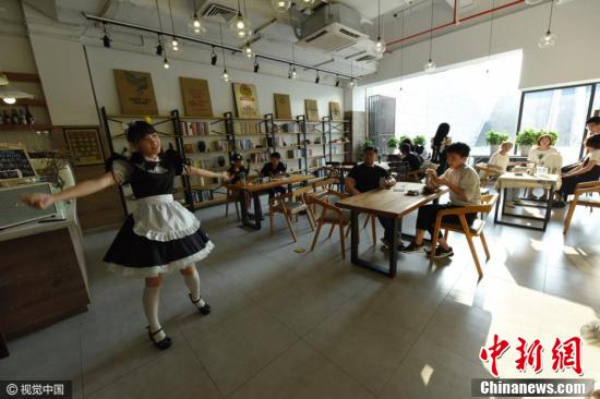 图为大学生身穿女仆衣服为顾客表演宅舞