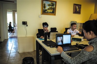 9月29日,邢丽正在房间里直播,“直播工厂”工作人员在办公区域观看直播情况并维持直播间的秩序