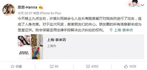 关于本次被打事件,当事人也在微博公开回应:“今天晚上九点左右,许某伙同其余七人在长寿路某餐厅对我突然进行了攻击,造成了人身伤害,对于这次风波,谢谢朋友们的关心,朋友圈的所有信息都会成为呈堂证供,我会保留运用法律手段解决此次纠纷的权利。 ”