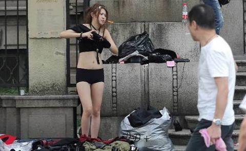 图为杭州,几名网店模特在街头拍摄服装新品,为节省时间,只好当街脱掉衣服,只剩内衣内裤,迅速换上另一套服装继续拍摄。