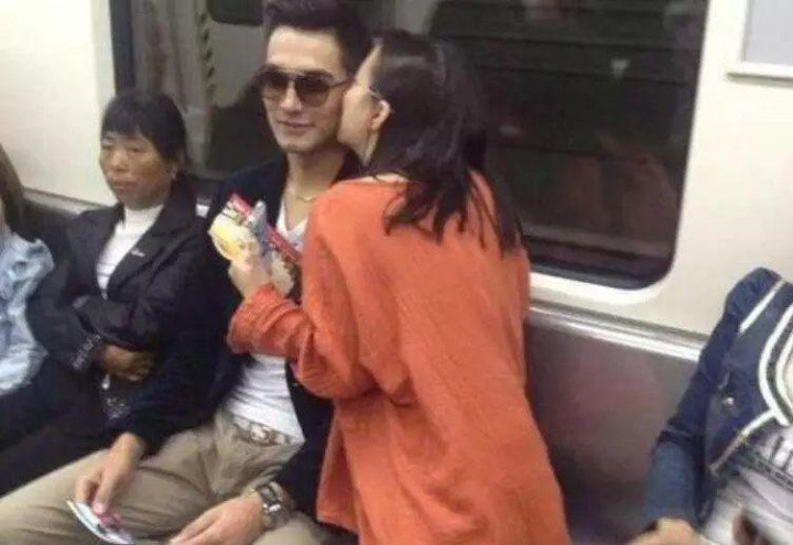 这对情侣在享受着女友的吻,脸上露着笑容,看上去应该很高兴。