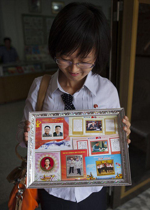 这位朝鲜大学的女大学生说,朝鲜约会的情景很保守,而且未婚先孕是绝不会发生的,因为在朝鲜这些是违反道德行为的,图为金小姐自豪地展示她收集的印有朝鲜领导人的邮票。