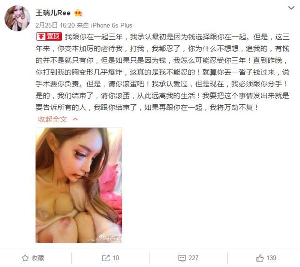 从这名网红自曝的途中可以看出,她被揍后的模样真是很吓人,眼睛被打肿,嘴角淤青,两个膝盖的伤痕非常明显。最刺眼睛的便是她胸前的马赛克,虽然图片已经经过了处理,但其胸部里白色的东西仍旧隐约可见,网友猜测这名网红的假体被打出来了。她本人曝料称,被男友打到胸部几乎变形。