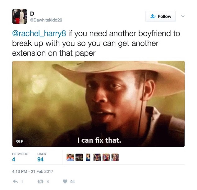 有网友表示理解,但也引来了网友吐槽。一名推特用户表示:如果你还有另一个男朋友,那么你还可以再延长一次提交作业的时间。据悉,Rachel的作业得到了B+的成绩。