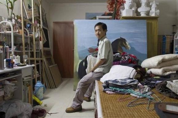 油画系学生背后的大油画和乱糟糟的房间有点不搭。