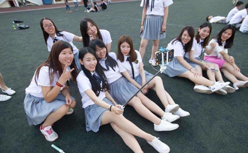 大学生们在教室内拍摄以《小时代》为主题的毕业照。