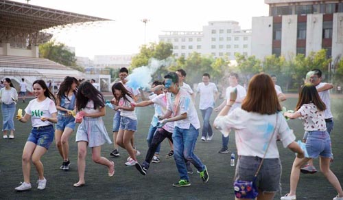 山西太原,大学生们在校园内拍摄“彩色跑”毕业照。