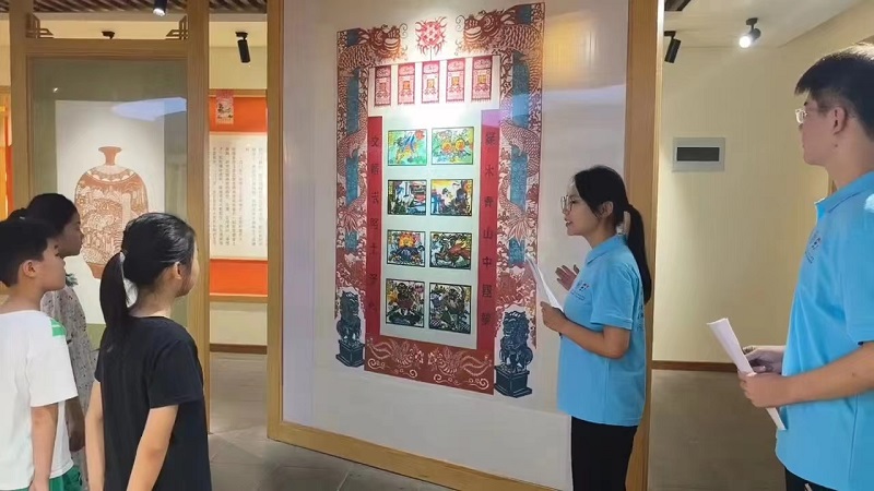 随后,实践团深入了解莒国古城文创产业发展情况,并运用自身专业所学,提供营销推广、品牌宣传等方面的帮助,拓展销售路径,助力非遗兴产;带领小朋友参观“剪纸物语”工作室,向小朋友们介绍过门笺的历史及图案颜色含义,让小朋友直观感受过门笺的轻灵精巧,让文化自信的种子扎根于小朋友们的心中,使剪刻下流淌的文化之韵在赓续传承中生生不息。