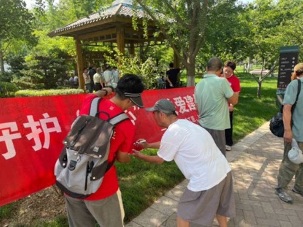 7月11日“情系筑城工匠,砼辈奋楫笃行”社会实践团队前往山东省淄博市人民公园开展群众动员工作。在得到园区管理人员允许后,活动正式开始。活动伊始,“情系筑城工匠,砼辈奋楫笃行”社会实践调研团在人民公园内悬挂宣传标语,并对市民就关爱建筑工人话题进行采访,以此来了解现代社会人民群众对建筑工人的态度及关注程度。与此同时,实践团成员邀请市民在横幅上签字,以此来提高市民对建筑工人的关注。在实践团队队员的动员下,市民们情绪高涨,热情的发表了对建筑工人行业的看法。