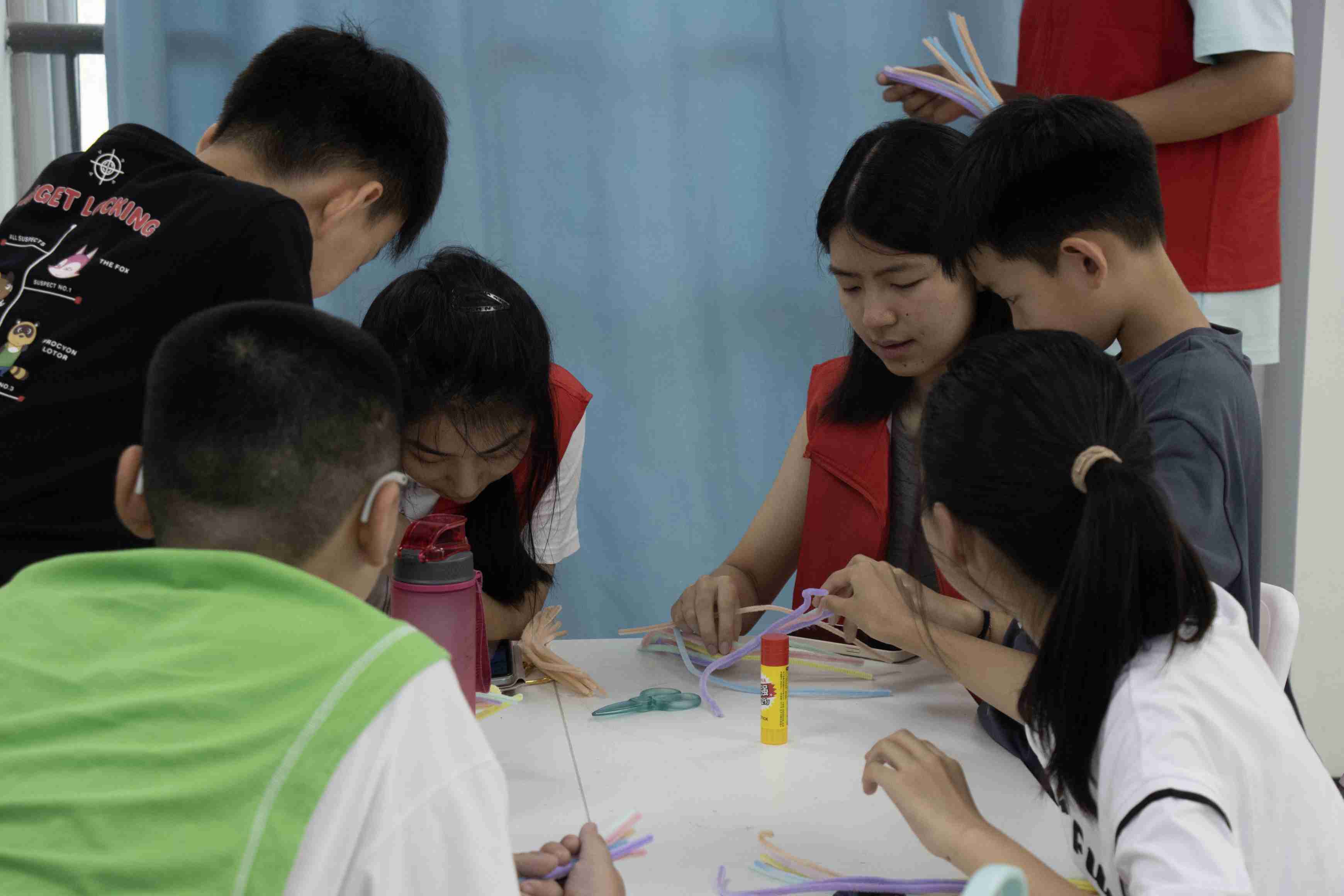 紧接着进行的是制作扭扭棒爱心戒指。小朋友们在志愿者准备的扭扭棒中选取了自己喜欢的颜色,在志愿者一步一步的耐心带领教学下,他们用自己灵巧的双手完成了爱心戒指的制作。每一个爱心戒指都蕴含着小朋友的用心、智慧与创意,因此每一个戒指都与众不同。