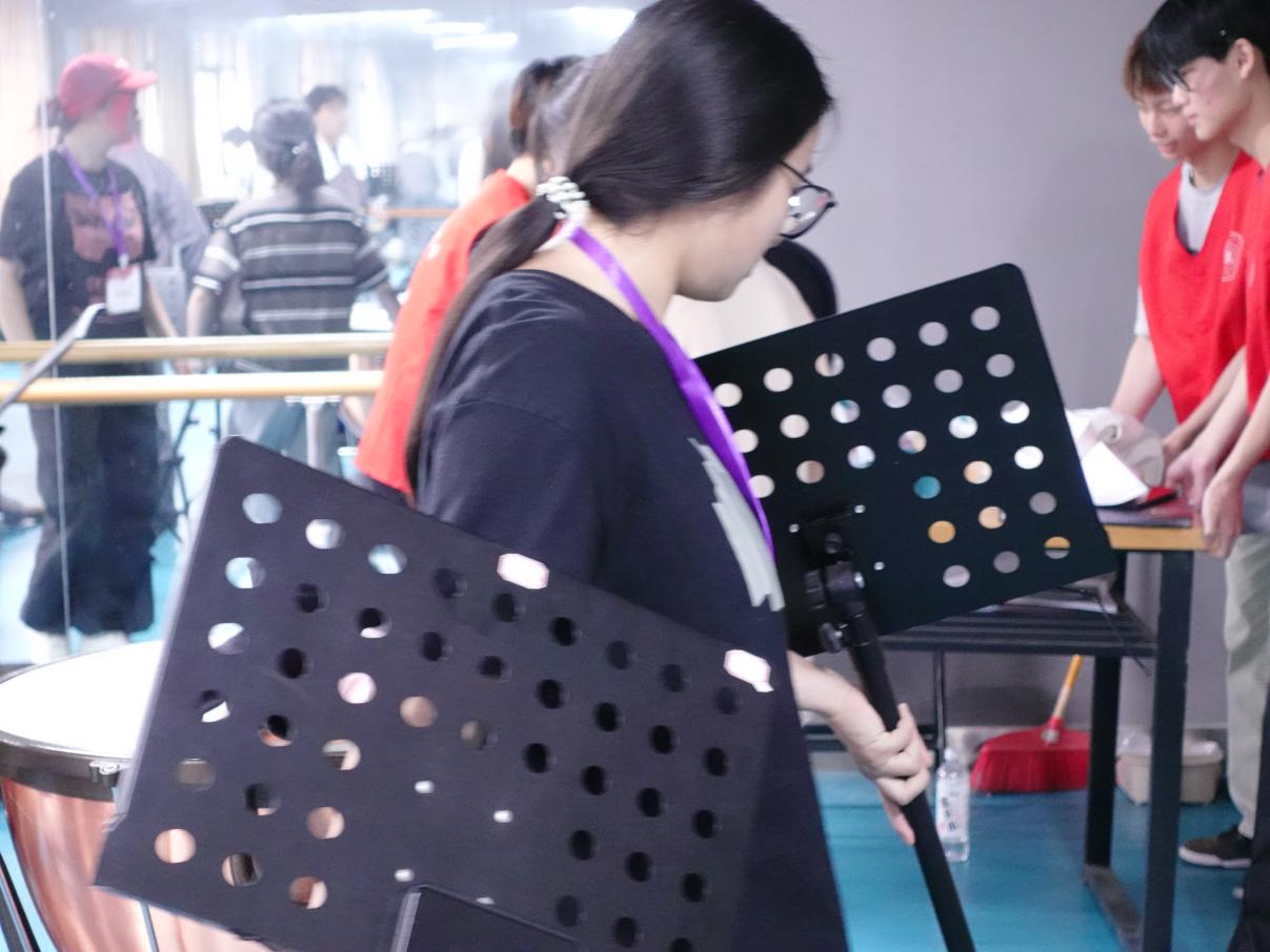 在音乐剧团队排练前,志愿者们提前将道具摆放到合适的位置,清理好舞台,等待音乐剧团队的到来。指导老师在记录音乐剧团队的注意事项时,志愿者也在记着自己的问题,两个团队配合也越来越熟练。