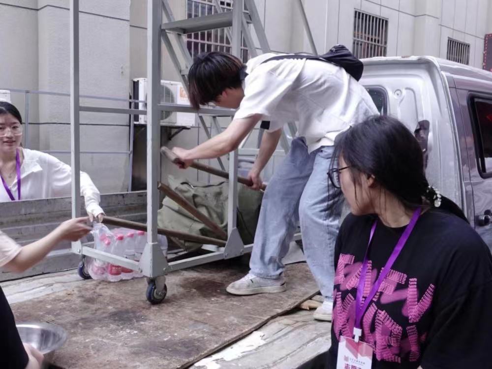 为了能够让音乐剧团队可以更好的完成表演,让他们可以安心表演,不需要被繁琐的事情绊住脚步,志愿实践团队联系了音乐剧负责老师,希望能够帮助音乐剧团队。志愿者团队将音乐剧团队需要的道具全部保管起来,每天负责核对道具的数量,将道具搬到音乐剧团队排练的地方。为了保证音乐剧团队的排练体验,实践队的志愿者们不顾困难,在炎热的夏日里,将道具搬到排练地点。志愿者团队之间合作,相互帮助,通过大家一起的努力,共同为音乐剧团队的同学们创造了一个良好的排练环境。志愿者团队表示能够为音乐剧团队贡献出一份力,他们也很开心。